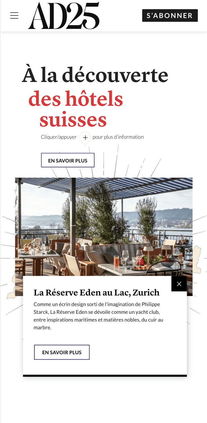For the Swiss Tourism Office, we developed a native article with an interactive module on AD.fr. The piece highlights the elegance and innovation of Swiss design hotels, seamlessly blending editorial storytelling with branded content.