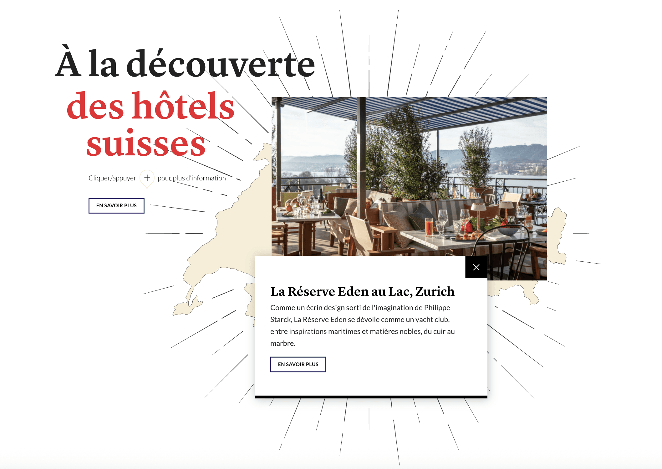 We crafted a visually immersive native article, enriched by an interactive module showcasing key Swiss design hotels. The module was designed to: